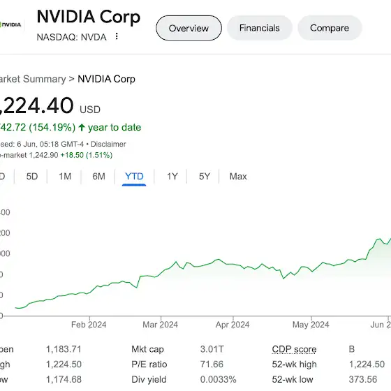 ⚡Вчора акції Nvidia, виробника відеокарт та мікрочіпів, зросли на більш ніж 5% і стали коштувати більше ніж $1,224.40. Це дало змогу компанії сягнути ринкової капіталізації в $3 трлн. і стати першим в історії виробником чіпів з такою великою капіталізацією.