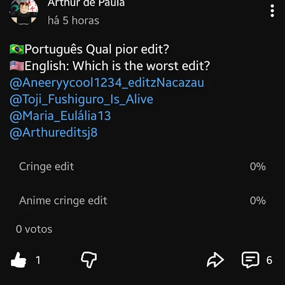 🇧🇷Português: Desculpa, pessoal, eu quis dizer que o edit era cringe, não quem eu marquei no post.