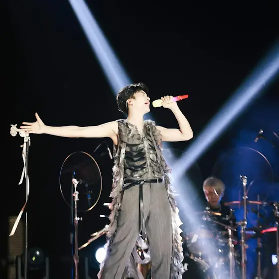@hzhf_larsss #黄子弘凡 wears Look 20 TYPE-1 full length Slashed shirt and Brewed Protein™ denim pants (material by @spiber_inc ) for his live performance in Shenzhen.