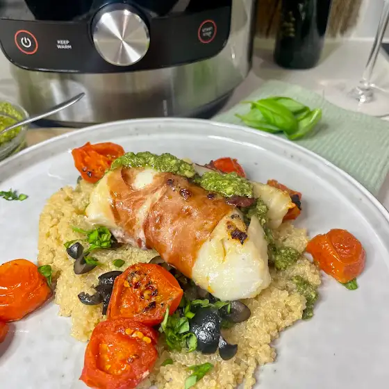 Cod Wrapped in Prosciutto with Roasted Tomatoes & Quinoa
