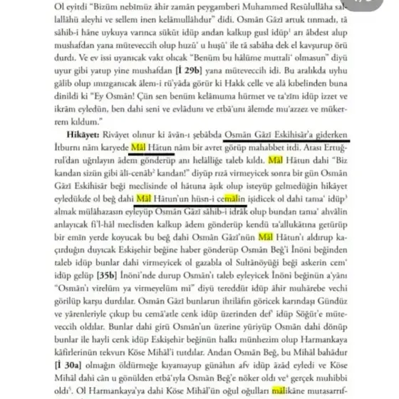 The daughter of Sheikh Edebali is not known by name, as it is not recorded in the historical records. The name Mal Hatun, also known as Rabia Bala Hatun, was given to her after she was married to Osman Gazi. It is interpreted that the name Mal was given later because Osman Gazi fell in love with Bala Hatun after seeing her. The name "Mal" is thought to derive from the Arabic root "Meyl," which means giving your heart, falling in love, and being emotionally attached. Its Turkish equivalent refers to "Jewel Woman," or "wealth" given to her by Osman Gazi. Orhan Gazi’s mother is Mal Hatun (Bala Hatun), the daughter of Sheikh Edebali and the wife of Osman Gazi. According to page 299 of the record on Orhan Gazi’s women, Mal Hatun, a Muslim known as Bala Hatun, was formerly a Byzantine Tekfur (local ruler or noble) and is noted in connection with Mihal, a comrade-in-arms during the reign of Osman Gazi. @SphireSphire
