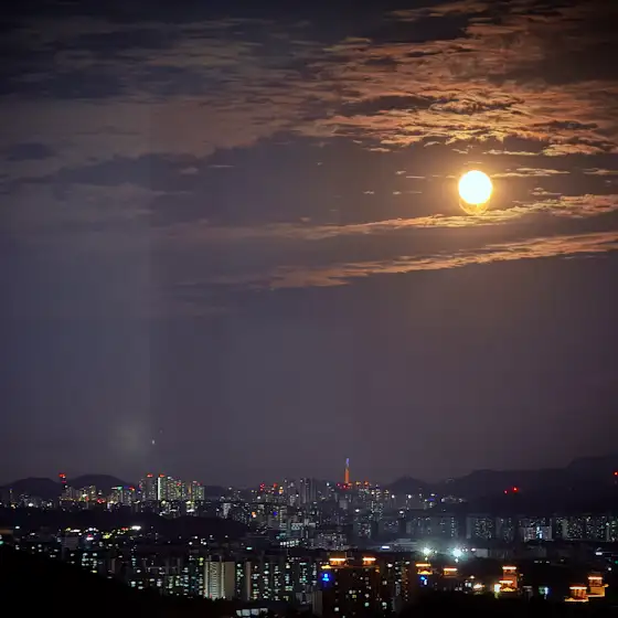 정말 크고 예쁜 달님이 도시를 비쳐주고 있습니다