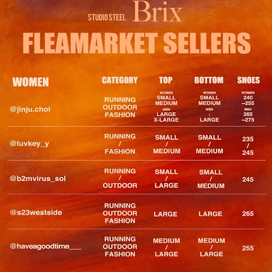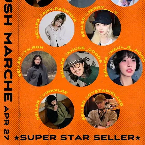 [참여 셀러 10팀] @khuss_goods / 호스트 박영감 @eastvirus_zombie / 오른팔 양잿물보이 @zziyoni / 스타일리스트의 옷장털이 프로젝트 (저렴이부터 명품까지) @handdongs / 개인 의류 및 잡화 @giiiiiyong / 개인 의류 @nyc_qqq / 뉴욕 출신 패션 VMD의 엄청난 개인 의류 및 잡화 초특가 @stable_ground_official / 하나하나 직접 셀렉한 빈티지 의류 및 미공개 제품까지 @aae_works / 빈티지 핸드워크 제품 10% 할인까지 @d_oroshop / 전품목 10% 할인 @inviteds.hop / 빈티지 의류 최대 50% 할인 피팅 가능 @tuffpuff_club / 에스닉 처돌이들 모여라! 봄 여름 맞이 악세사리 모음집𖡄 @swimming.green / 공간에 생명을 불어넣는 특별한 초록 친구들