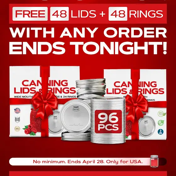 Get 96 FREE FORJARS lids & rings (24 Wide Mouth Canning Lids & Rings + 24 Regular Mouth Canning Lids & Rings) with ANY order - no minimum.