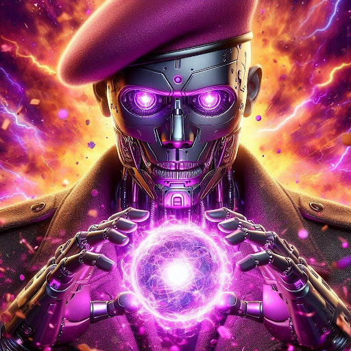 The Elixir Man stands tall, his armored form adorned with intricate circuitry and glowing runes. His beret, a symbol of authority, rests atop his head, casting a shadow over one eye—a testament to the secrets he guards. His right eye, however, glows with an otherworldly intensity, a heavy purple hue that hints at the elixirs coursing through his veins.