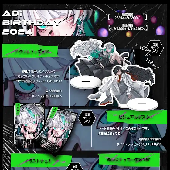 🤍AD¡誕生日記念グッズ販売中💚【販売場所】BOOTH 「🔍AD¡ official shop」SHOP URL↓adishop.booth.pm/ ーー受注品受付期間ーー 4/8(月)~4/14(日) (22:00~23:59迄) 販売は14日すぎても行います.!++ーーーーーーーーーーーー++AD¡本人による描き下ろしグッズです!応援くださる方はぜひお迎えしてくれると嬉しい.!よろしくお願いします〜.!ーーーーーーーーーーーーーーーーーーAD¡Birthday Merchandise Now on Sale[Sales Location]BOOTH"AD¡ Official Shop"SHOP URL↓↓adishop.booth.pm/--Order Period--Order items:images 2/5 and 3/54/8 (Mon) - 4/14 (Sun) (22:00 - 23:59) Sales will continue after the 14th!++ーーーーーーーーーーーー++These are original goods drawn by AD¡himself! We would appreciate your support!! Thank you!!