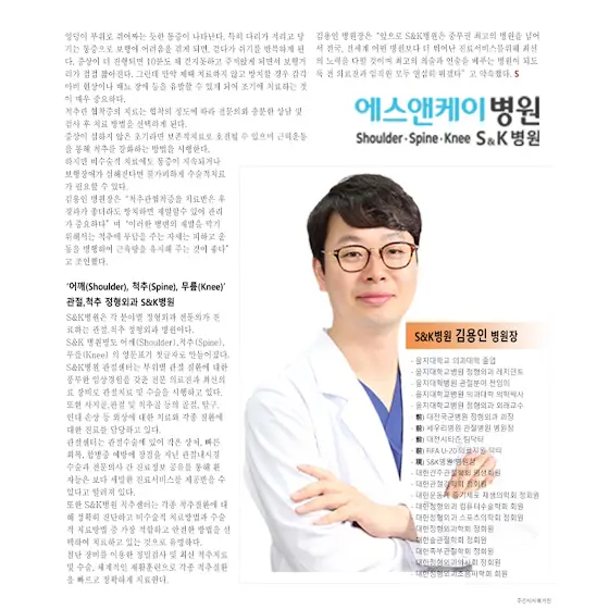 S&K병원의 관절ㆍ척추분야의 연구와 더불어 정직하고 우수한 치료를 위해 끊임없이 노력한 결과 환자분들의 만족도를 높일 수 있었고 결과적으로 2023년 대한민국 100대 명의에 선정될 수 있었던 것 같습니다.