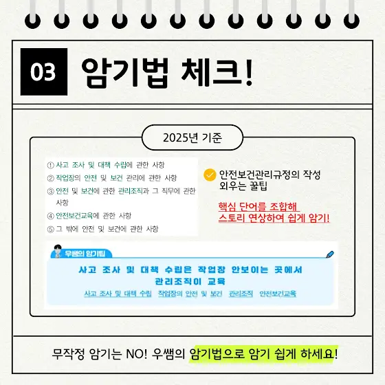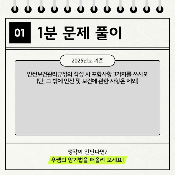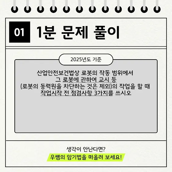 📘 산업안전기사 1분 암기고사 🕒 지금 바로 본인의 실력을 확인해보세요! ✍️ 이런 문제, 알고 있으면 합격 가까워집니다! 📑 오늘도 암기 한 문제 클리어 해보세요! 2025년 우쌤의 암기법 영상이 궁금하다면? 영상 바로가기 👉 https://youtu.be/iQBYL3SantA