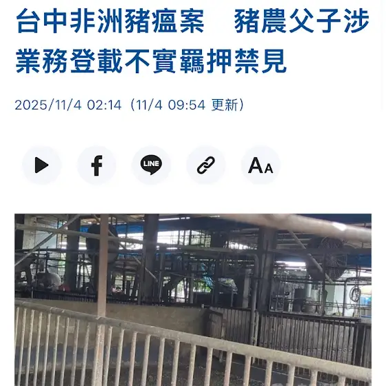 三度約談,供詞反覆😡法院核准羈押禁見🔥台中市府,誰說有去稽查的😒誰跑進去亂清消的😒—養豬場爆非洲豬瘟,有關死亡豬隻送化製的三聯單疑遭塗改,且案例場還將廚餘分給其他豬場。檢方昨天約談經營者陳姓父子後,11/4凌晨依業務登載不實文書罪嫌,向法院聲押禁見獲准。