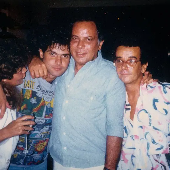 Cazuza com seu pai João Araújo, Ezequiel Neves e sua empresária Rosa Almeida em sua festa de aniversário em 1986.