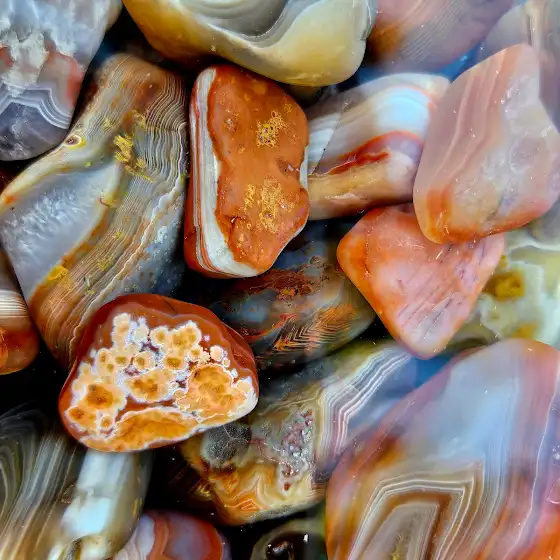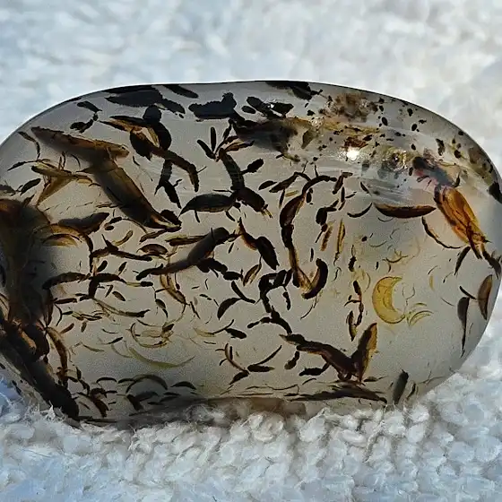 These are some pictures of the beautiful SD prairie agates and one MT moss agate that I bought from  @TheoKellison  . What do you see in the MT agate? My mind sees a man running (hurdles) through a forest at night with a lot of birds around him. The crescent moon is shining brightly in the lower right side. Is that a parrot sitting on a branch to the right of the moon? Ok, my artist mind just wandered... If anyone has prairie agates they don't want, let me know. I love tumbling them.