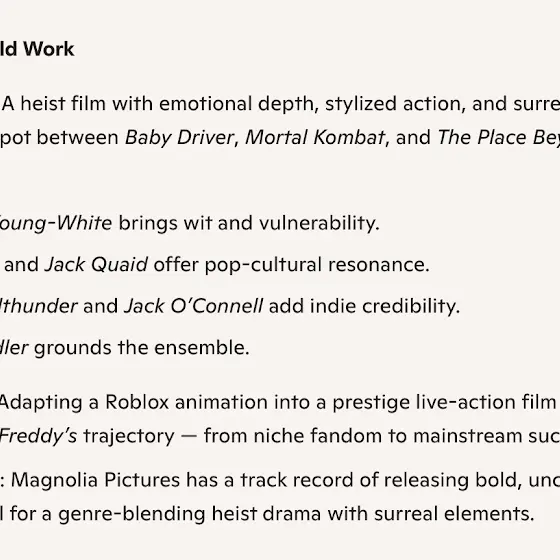 Note: from the distributors of the machine (2023) and the investigators (2024) Note 2: from the producers of surfs up (2007), Grindhouse (2007), strays (2023), last Vegas (2013), white boy Rick (2018), catching fire: the story of Anita Pallenberg (2024), IT (2017), and sometimes I think about dying (2023) Note 3: the movie will be rated R and/animation/horror film Note 4: "Georgia entertainment industries" will appear at the end