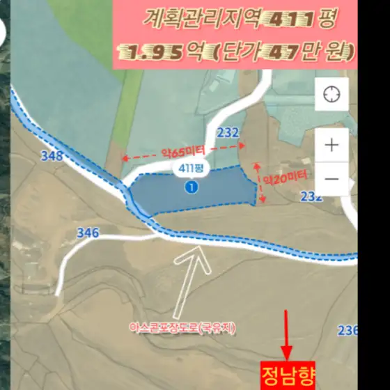 천안시 북면 계획관리지역 411평 1.95억 (평당47만 원)정남향 아스팔트로로접(국유지 폭3미터)문의 010-6456-1577