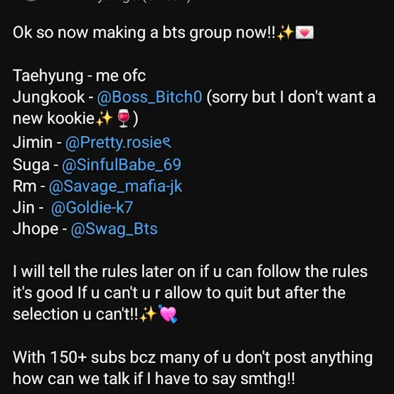 NOTE:- ✨️WE WILL CREATE FULL VIBES OF BTS ✨️ EVERY MEMBER HAS TO SUPPORT ALL THE MEMBERS SO SUBSCRIBE EVERYONE'S CHANNEL RN!! ✨️NO FIGHTS!! ✨️IF U ALL R AGREE WITH THESE TERMS THEN WLC AND IF NOT U CAN LEAVE