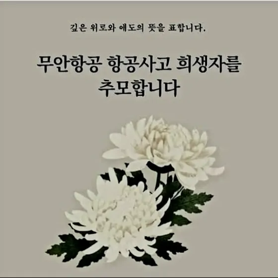 가슴이 너무 아프고 어찌할 바를 모르겠습니다. 안타깝게 세상과의 인연을 마감하신 제주항공 여객기사고 희생자분들과 그 가족분들께 위로의 마음을 전하며 애도기간 7일동안 뿐 아니라 그 후에도 미안함과 그 슬픔을 간직하며 살겠습니다.
