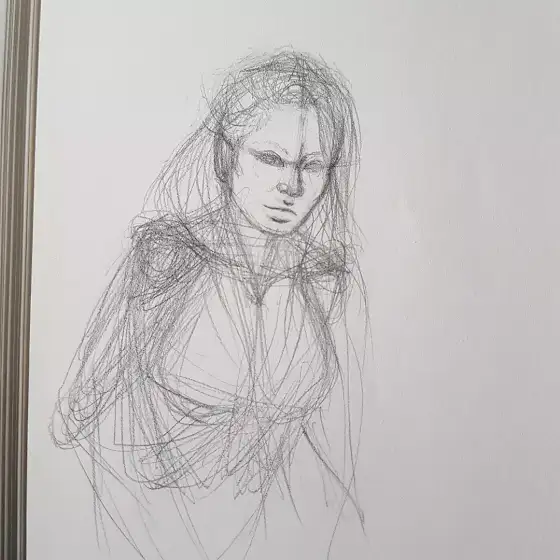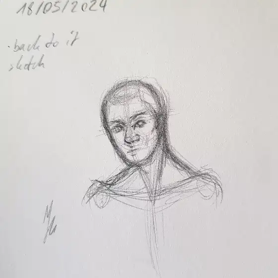 Alt text: A small mechanical pencil sketch in my physical sketchbook. In the top left-hand corner are the date "18/05/2024" & a note reading "•back to it" & underneath it "sketch". The sketch is a rough drawing of a male-read human ending at the shoulders. Guidelines for anatomy are still visible like his face's centre line & circles for the shoulders & the character is bald. His head is slightly tilted down & turned to his right a bit. We see more of his face's left side than his right but not by too much. He's looking to his left. His left shoulder is further up than his right by a smidge. Beneath the sketch to the left sits my signature.