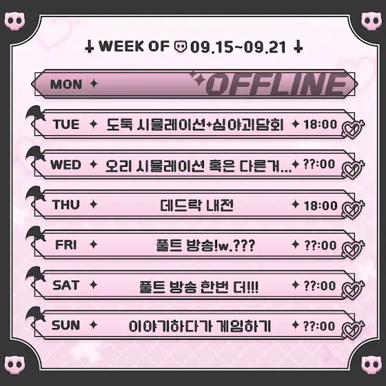 😈25.09.15~25.09.21🩹✦ 치카 스케쥴표 ✦ chzzk.me/Llvsd