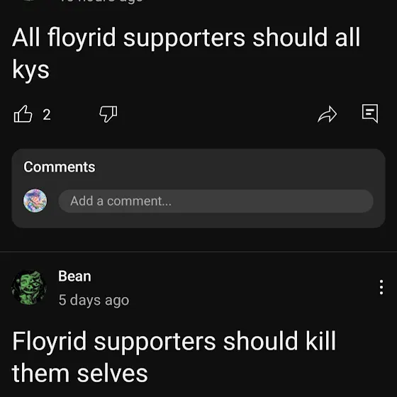 Beaniszilly has only recently made posts saying "Floyrid Supporters should kys" and "All Floyrid supports should all kys".