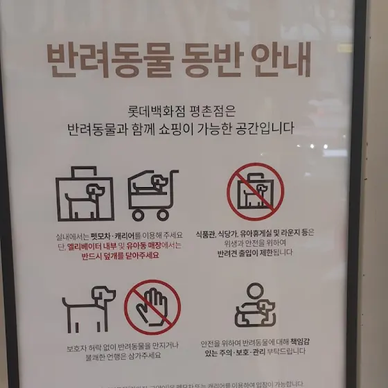 롯데 백화점에 반려동물 가능 표지판을 보고