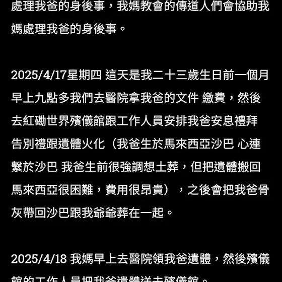 對不起。我爸剛剛早上十點多已經走了 他已經回到神的懷抱裡安息