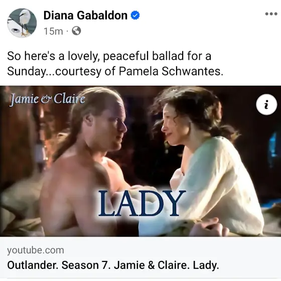 I am thrilled that Diana Gabaldon mentioned my new video on her Facebook page! It is a dream come true for this old lady! Thank you, Sassenachs, for all of your support. Long live Outlander Love!
