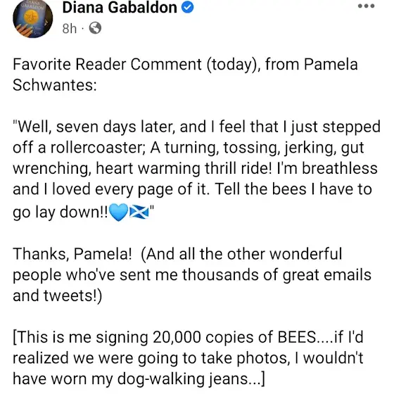I emailed Diana Gabaldon, telling her how much I enjoyed, "Go Tell the Bees That I Have Gone," and she posted my message on her Facebook page!! I was overwhelmed!