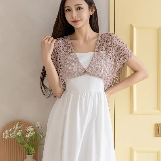 전체 실루엣이 여리여리 여성스럽고 탑에서 부터 방울무늬로 포인트를 주어 한결 날씬해 보이게 만들고 더불어 밑단의 무늬로 더더 날씬해 보이는 가디건인거 같아요^^ (영상은 내일 업로드 됩니다.) 가디건으로 코디해도 되고 볼레로 형식으로 원피스에 코디해도 안성맞춤인거 아시져?
