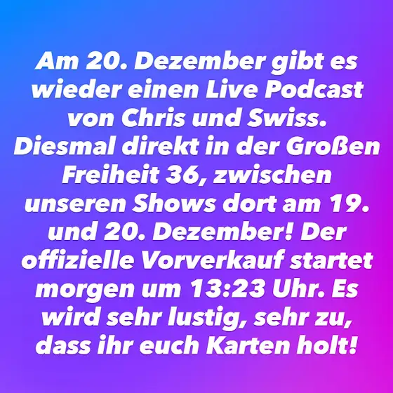 Hey Leute, wir sind gerade in 🇩🇰 und machen ein bisschen Musik und andere hoch produktive Sachen. Vielleicht bekommt ihr ja irgendwann mal was davon zu hören. Viel wichtiger ist, dass es am Montag richtig gute Neuigkeiten für uns alle gibt! Ich würde so gerne schon Spoilern, aber dann würde ich die Überraschung kaputt machen und das wäre doof. Und unfair. Und gemein. Und so bin ich nicht. Deswegen: Bis Montag!