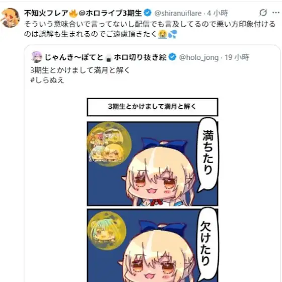 我在直播中也有說過,我並沒有要用(月)缺表達少了誰的意思,如果把畫或是立繪跟這句話放在一起,可能會導致看到的人產生我是那個意思的誤解,所以還請不要這樣😞