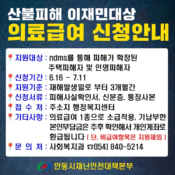 산불피해 이재민대상 의료급여 신청안내📢 산불피해 이재민대상 👉 의료급여 신청안내 💓 📍지원대상: ndms를 통해 피해가 확정된 주택피해자 및 인명피해자 📍신청기간 : 6.16 ~ 7.11 📍지원기준 : 재해발생일로 부터 3개월간 📍신청서류 : 피해사실확인서, 신분증, 통장사본 📍접 수 처 : 주소지 행정복지센터 📍기타사항 : 의료급여 1종으로 소급적용, 기 납부한 본인부담금은 추후 확인해서 개인계좌로 환급됩니다 ( 단, 비급여항목은 지원제외) 📍문 의 처 : 사회복지과 ☎054) 840-5214 #안동 #안동시 #마카다안동 #민선8기 #위대한 #시민 #새로운 #안동 #누리는 #삶 #더하는 #행복 #나누는 #미래