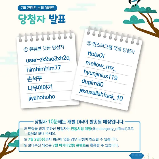 마카다안동 ‘안동에 가면 까치도 있고’ 콘텐츠 소재 이벤트 당첨을 축하드립니다!