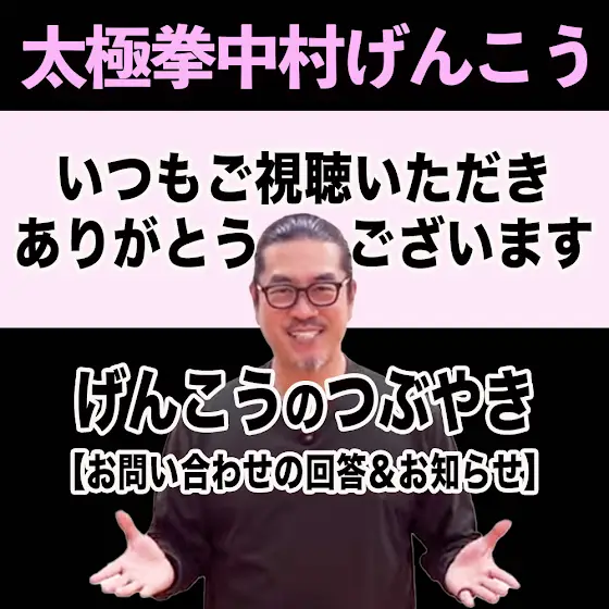 太極拳愛好家の皆様へ。こんにちは、中村げんこうです。いつもご視聴&応援いただきありがとうございます。