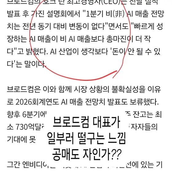 브로드컴 대표가 브로드컴 떨구는 기사 내는것보니 일부러 차익실현매물 쏟아져 나오게 만들고 공매도 유도하고 저점에서 다시 매집하라는 신호 주네.