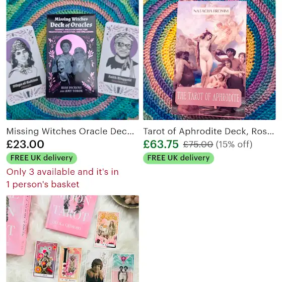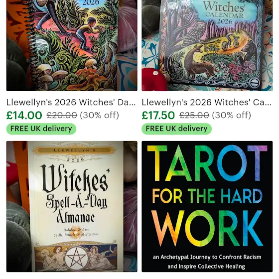 Calendars, indie and mass market tarot, even my readings. Once the stock clears I will close the shop. UK only (except tarot readings which are digital)