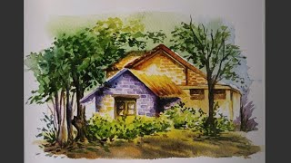 Simple watercolor landscape painting for beginners| rural scene| village scene|