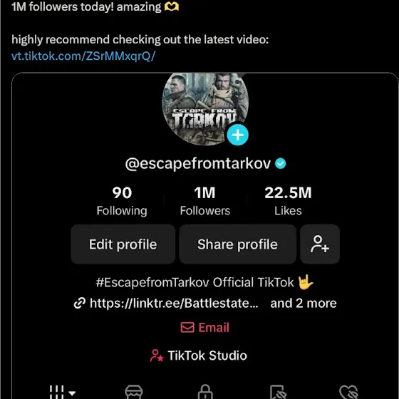 Didn't see this in time to get it into the last update video, but there is a PROMO CODE on Tarkov celebrating their account hitting 1m followers on TikTok.