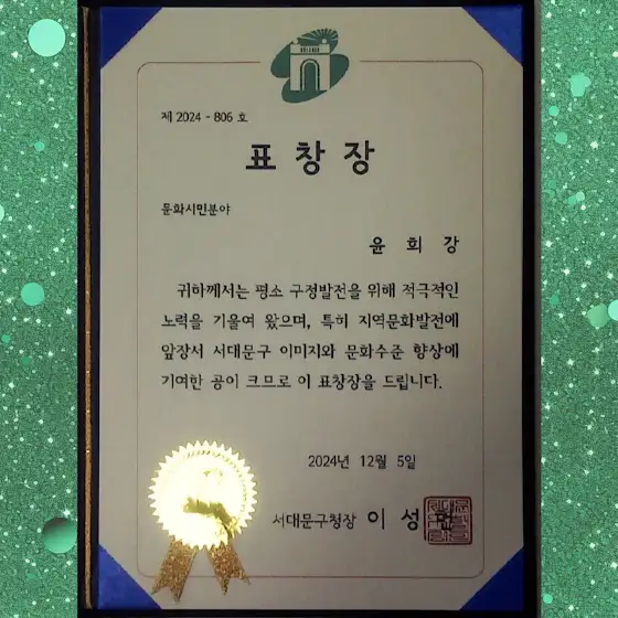 서대문구청에서 주최한 문화시민분야의 상장수여(본인)사진과