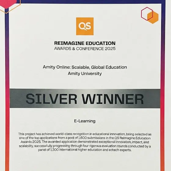 Honoured to share that Amity Online has been recognised as a Silver Winner at the QS Reimagine Education Awards 2025 — selected from over 1,600 global submissions.