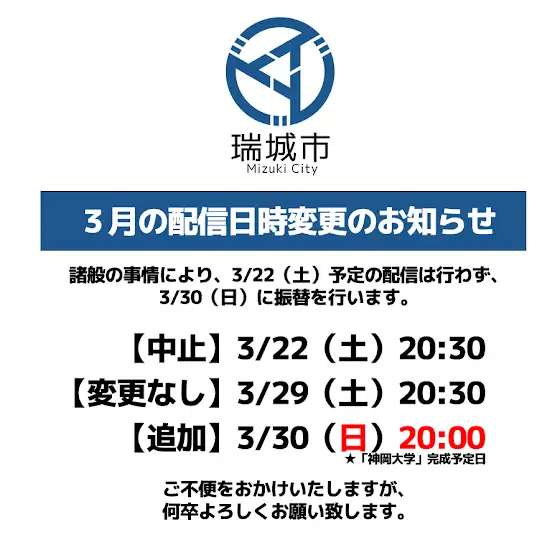 今週土曜日(22日)の瑞城市配信はお休みし、来週の土曜・日曜(29日、30日)が連続の配信となります。ご不便をおかけいたしますが、何卒よろしくお願いいたします。