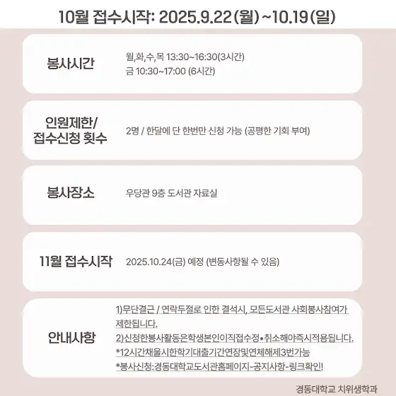 안녕하세요. 경동대학교 치위생학과입니다. 경동대학교 중앙도서관 교내 봉사활동 신청 접수가 9월 22일 월요일부터 10월 19일 일요일까지 진행됩니다. 봉사에 관심이 있는 학우분들은 일정 참고하시기 바랍니다.#경동대학교 #경동대 #치위생학과 #치과위생사 #치위생 #치위생과