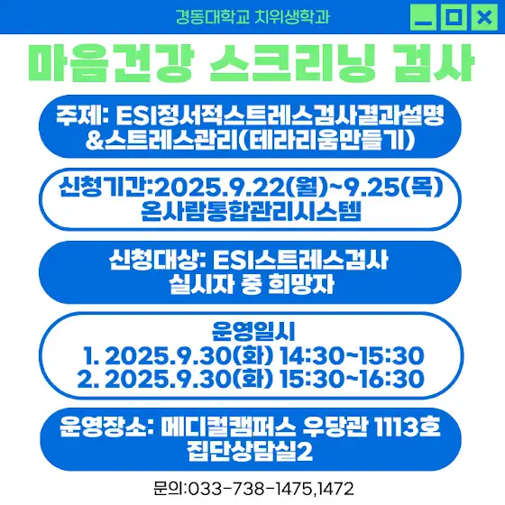안녕하세요. 경동대학교 치위생학과입니다. 마음건강 스크리닝 검사를 9월 30일 화요일 14:30부터 16:30까지 메디컬캠퍼스 우당관 1113호에서 시행합니다.신청기간은 9월 25일 목요일까지 온사람통합관리시스템에서 신청 가능하오니 많은 참여 바랍니다.#경동대학교 #치위생학과 #치과위생사 #치위생 #치위생과