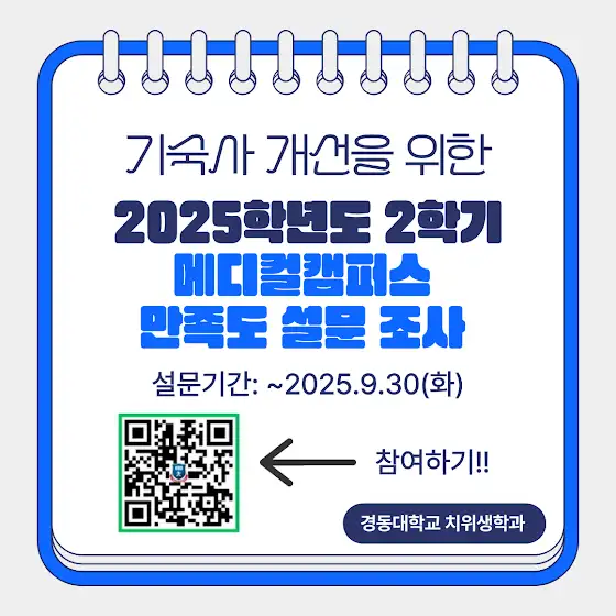 안녕하세요.경동대학교 치위생학과입니다.기숙사 개선을 위한 2025학년도 2학기 메디컬캠퍼스 만족도 설문 조사가 9월 30일 화요일까지 진행되오니 많은 참여 바랍니다.#경동대학교 #경동대 #치위생학과 #치과위생사 #치위생 #치위생과