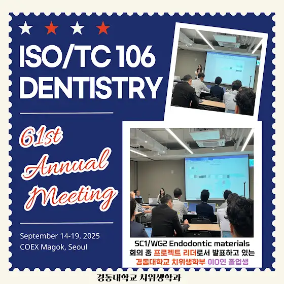안녕하세요.경동대학교 치위생학과입니다.제61차 ISO/TC 106(국제표준화기구/치과기술위원회) 총회가 대한치과의사협회와 식품의약품안전처 주최로 9월 14일부터 19일까지 6일간 코엑스 마곡에서 개최되고 있는데요.이번 ISO/TC 106 서울총회에서는 300여 명의 국내외 표준 전문가들이 모여 치과 재료, 치과용 기구와 장비, 구강관리용품 등 치과 의료기기 국제 표준화 작업을 진행합니다.특히!!!!!!!! 경동대학교 치위생학부 이O인 졸업생(18학번)이 전자 근관길이 측정기의 정확도 요구사항 및 시험방법을 규정한 국제표준안에 관한 발표를 진행하여 더욱 뜻깊은 시간입니다~^^멋진 경동대학교 치위생학과의 행보!많은 관심 바랍니다.#경동대학교 #경동대 #치위생학과 #치과위생사 #치위생과 #치위생