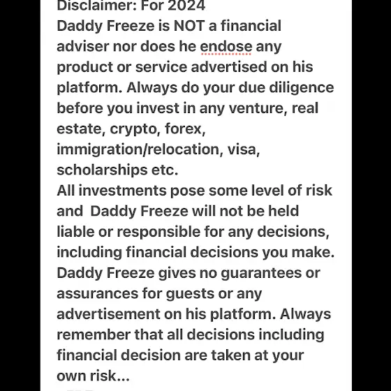 Public Notice: - Disclaimer: Daddy Freeze is NOT a financial adviser nor does he endose any product or service advertised on his platform. Always do your due diligence before you invest in any venture, real estate, crypto, forex, immigration/relocation, visa, scholarships etc. All investments pose some level of risk and Daddy Freeze will not be held liable or responsible for any decisions, including financial decisions you make. Daddy Freeze gives no guarantees or assurances for guests or any advertisement on his platform. Always remember that all decisions including financial decision are taken at your own risk… ~FRZ