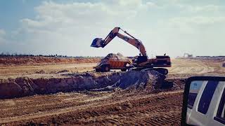 Cat 365 Excavator loading Cat Belly Dumps & Bell D40E digging out Detention Pond for Harris County