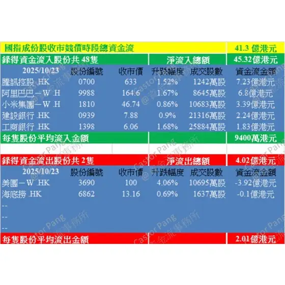 總結:今日港股三大指數全線上升,但收市競價時段錄得資金淨流出,顯示投資者偏向看淡後市。恒指、國指及科指的拋貨比率均低於70%,反映投資者沽貨意欲不強,但資金流出金額均未達10億港元,顯示沽壓相對溫和。其中,小米集團-W (1810.HK)錄得最大資金流入,達3.21億港元,而騰訊控股 (0700.HK)則錄得最大資金流出,達6.78億港元。整體而言,資金流向動能偏弱,投資者情緒謹慎,後市走勢需視乎外圍市場及經濟數據表現。