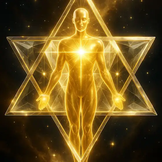 Распаковка через символ Божественного Света Человека, покровительства и духовной защиты. Трёхмерная звезда Тетраэдр соединяющая мужское - Духа и женского Материю - начал, антропогенный алгоритм процветания, целостности и единства.