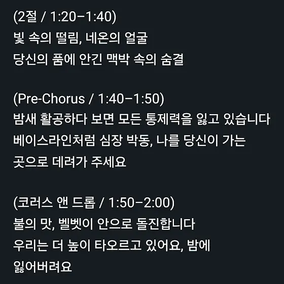 youtube.com/shorts/bpKN9bQ74f...ㄴ 해찬이 솔로 곡 궁예한 자작곡🐻🐻💚💚(가사는 하단에) [Intro](숨소리 섞인 읊조림)Yeah…Can you feel me now?⸻[Verse 1]붉은 조명 속, 너와 나아슬하게 스친 온기말없이도 다 느껴져눈빛만으로 충분해너의 향기, slow motion귓가에 맴도는 tension손끝이 닿을 듯 말 듯우린 지금 경계 위⸻[Pre-Chorus]차오르는 숨결속삭이듯이 번져밤은 길어, 아직 우리에겐멈추지 마, 이 순간⸻[Chorus]You’re my velvet light조금씩 더 물들어어둠 속 널 비춰놓지 못하게 해숨을 참은 채너의 온도 속에 dive이 밤에 젖어끝없이 fallin’⸻[Verse 2]시선 끝에 담긴 너모든 게 느껴져촉촉한 공기, 그 속에네가 내 안에 흘러말하지 마, 그냥 느껴시간조차 우리 편이야너와 나만의 리듬으로끝까지 타올라⸻[Bridge]멈춘 듯 흐르는 이 beat너는 나의 gravity자꾸만 더 깊어져This pull, I can’t escape⸻[Final Chorus]You’re my velvet light눈 감아도 보여 널밤의 끝에 닿아더욱 선명하게너란 universe내 모든 감각이 fly하나 되어가Just you and I⸻[Outro]Light me up널 따라가는 나Velvet night…Velvet light…