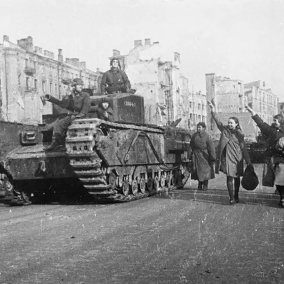 Тяжелые танки Черчиль 48-го гвардейского танкового полка прорыва 5-го гвардейского Сталинградского танкового корпуса в Киеве.