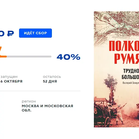 Сегодня мы достигли 40-процентной отметки в сборах на издание книги Валерия и Виктора Замулиных «Полководец Румянцев». Трудное начало большой победы». До следующей важной вехи — 50 процентов, когда наша кампания получит статус успешной осталось совсем немного.